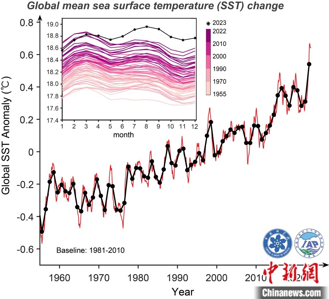 根據(jù)IAP/CAS溫度數(shù)據(jù)產品(1米層)分析的1955年至2023年12月全球平均海表溫度變化。黑線為年均值,紅色為月均值;異常值為相對于1981-2010年常年值;左上角內框為海表溫度的季節(jié)變化。中國科學院大氣物理研究所/供圖