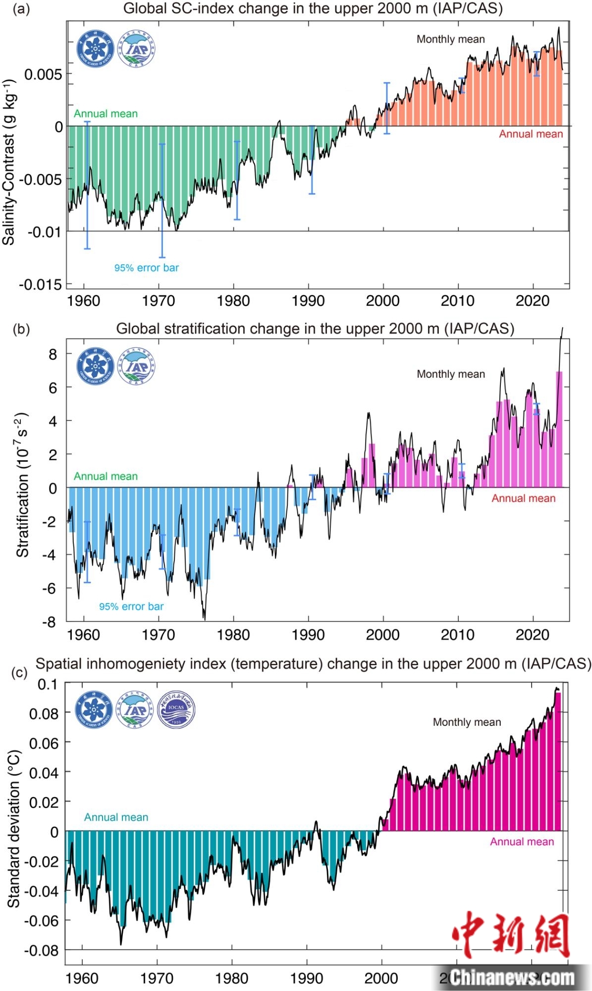 1958-2023年全球海洋上層2000米鹽度差指數(shù)SC(a)、層結(b)、溫度空間非均勻性指數(shù)(c)變化時間序列。黑色線條為月度變化,條狀色條為年變化。中國科學院大氣物理研究所/供圖