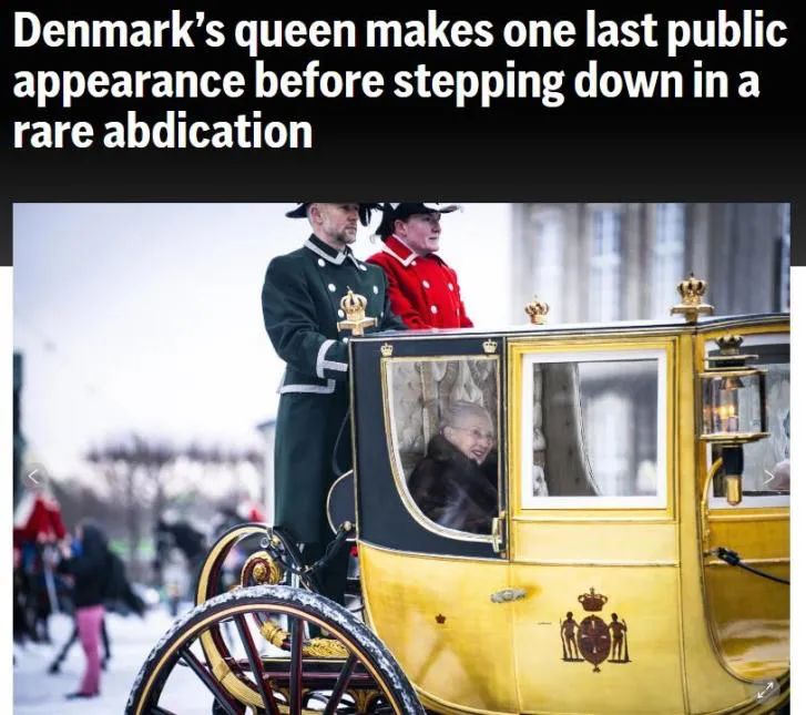 當(dāng)?shù)貢r間1月4日,是丹麥女王瑪格麗特二世最后一次以君主身份公開露面?,F(xiàn)年83歲的女王乘坐“金馬車”穿過丹麥?zhǔn)锥?,不少民眾冒著?yán)寒、強(qiáng)風(fēng)和雨雪,在沿途為她揮舞旗幟并歡呼。