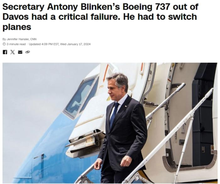 中新網1月18日電 據美國有線電視新聞網(CNN)報道,當地時間1月17日,美國國務卿布林肯參加完達沃斯論壇從瑞士蘇黎世返程時,其乘坐的波音737飛機出現“嚴重故障”。