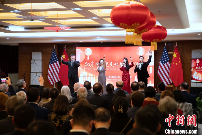 當(dāng)?shù)貢r(shí)間1月17日,中國(guó)駐紐約總領(lǐng)館舉行中美建交45周年招待會(huì)。圖為現(xiàn)場(chǎng)表演美聲聯(lián)唱《為祖國(guó)干杯》《飲酒歌》。 中新社記者 廖攀 攝