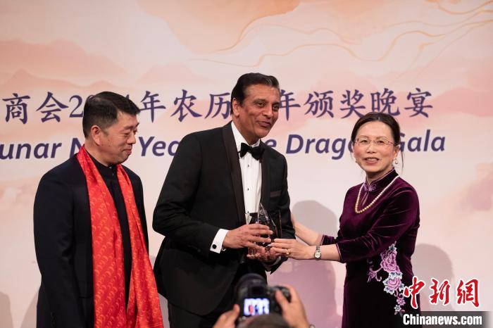 當(dāng)?shù)貢r(shí)間1月18日,美國(guó)中國(guó)總商會(huì)(CGCC)在紐約舉行2024年農(nóng)歷龍年頒獎(jiǎng)晚宴。圖為中國(guó)駐美國(guó)大使館公使徐學(xué)淵(右)為聯(lián)邦快遞總裁兼首席執(zhí)行官拉杰·蘇巴馬廉(中)頒發(fā)“國(guó)際領(lǐng)導(dǎo)力獎(jiǎng)”?!≈行律缬浾?廖攀 攝