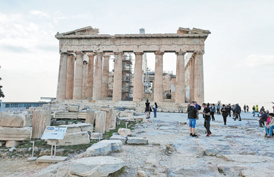 近期,希臘雅典衛(wèi)城山頂?shù)呐撂剞r(nóng)神廟迎來(lái)大量游客。