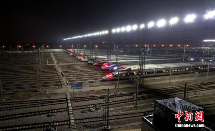 資料圖:航拍動(dòng)車組??吭谖錆h動(dòng)車段的存車線上,蓄勢(shì)待發(fā)。 張暢 攝