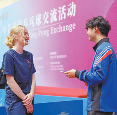 弗吉尼亞大學(xué)學(xué)生米莎與清華大學(xué)學(xué)生曾加寶組成搭檔。在練習(xí)環(huán)節(jié)中,對手朝著米莎的方向打來一記高難度弧圈球,米莎一時間有些不知所措,只聽曾加寶喊了一句“我來”,便眼疾手快地沖了過去,擋在米莎前面,接住了這個球。這有趣又溫馨的一幕,引來了現(xiàn)場觀眾的掌聲,也瞬間拉近了兩個年輕人的距離?!拔业拇顧n一直鼓勵我,耐心地指導(dǎo)我握拍、擊球。我們一起討論乒乓球和學(xué)業(yè),現(xiàn)在已經(jīng)成了朋友?!泵咨f。