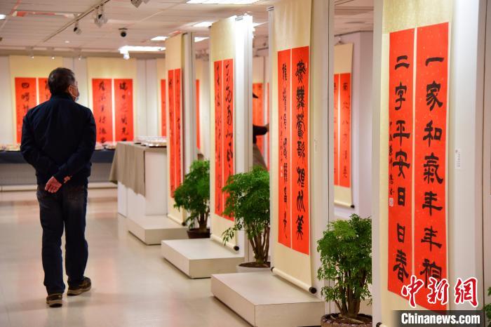 1月28日,兩岸藝術(shù)家春聯(lián)展在臺北江山如此多嬌藝術(shù)館舉行,32位臺灣藝術(shù)家、13位大陸藝術(shù)家的90多幅作品參展。圖為現(xiàn)場展出的春聯(lián)作品。中新網(wǎng)記者 路梅 攝