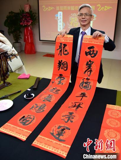 1月28日,兩岸藝術(shù)家春聯(lián)展在臺北江山如此多嬌藝術(shù)館舉行。圖為臺灣中華書道學(xué)會理事長楊旭堂當場揮毫?xí)鴮憽皟砂逗推介_景運,龍翔云起展鴻圖”。中新網(wǎng)記者 路梅 攝