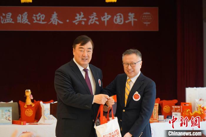 圖為中國駐韓國大使邢海明(左)向與會代表發(fā)放春節(jié)包。金琳 攝