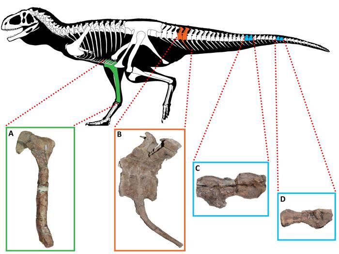 受病變影響的巴塔哥尼亞阿貝力龍骨骼。A.柯氏基爾梅龍右脛骨內(nèi)側(cè)視圖;B.加氏奧卡龍的第5和第6尾椎骨及第5脈弓左側(cè)視圖;C和D為迷霧嚙王龍的中和后尾椎骨左側(cè)視圖(圖片來(lái)自Ales)。施普林格·自然/供圖