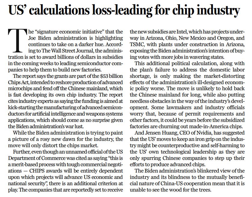 美國失策的經(jīng)濟政策本已造成市場扭曲,疊加出于政治意圖的算計,以及補貼也無法解決的勞動力短缺問題,這一切只會讓扭曲態(tài)勢進一步惡化。此舉不太可能長期遏制中國大陸,但卻給行業(yè)發(fā)展帶來種種不必要的障礙。美國部分國會議員及企業(yè)高管擔心,受到許可要求及其他因素影響,享受補貼的企業(yè)可能要花費很多年才能生產(chǎn)出美國制造的芯片。