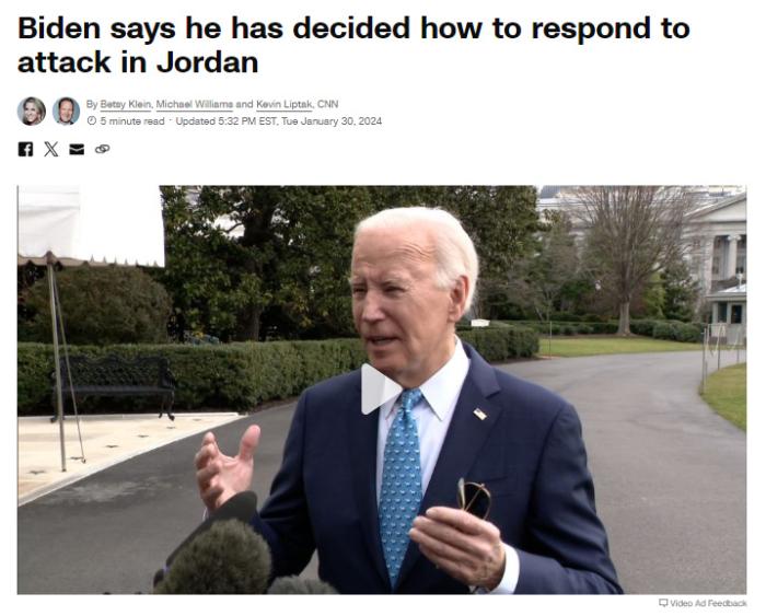 中新網(wǎng)1月31日電 據(jù)美國有線電視新聞網(wǎng)(CNN)報道,當(dāng)?shù)貢r間30日,美國總統(tǒng)拜登表示,他已就美國如何應(yīng)對約旦美軍基地遇襲事件做出決定。早些時候,該襲擊造成3名美軍士兵死亡、數(shù)十人受傷。