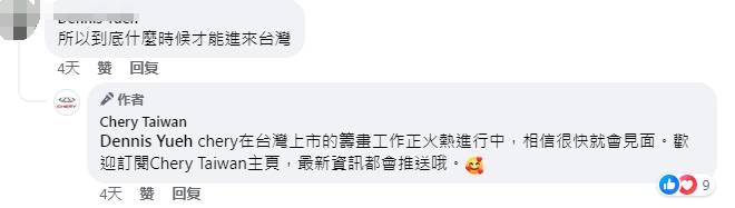 早前,奇瑞官方在臉書創(chuàng)立“Chery Taiwan”,并從去年開(kāi)始更新專業(yè)內(nèi)容,針對(duì)一款中型運(yùn)動(dòng)型多用途汽車已多次發(fā)布宣傳影片。有不少臺(tái)灣網(wǎng)友在該賬號(hào)咨詢?cè)摽钇嚭螘r(shí)會(huì)在臺(tái)灣上市,該賬號(hào)回復(fù),目前在臺(tái)灣上市的籌劃工作正火熱進(jìn)行中,相信很快就會(huì)見(jiàn)面。