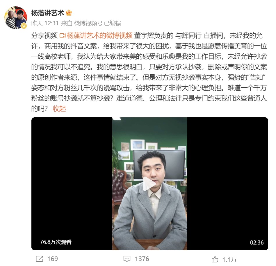 近日,擁有百萬粉絲的人文藝術(shù)博主楊藩發(fā)布視頻稱,“與輝同行”主播董董抄襲自己的視頻文案,再度將董宇輝直播團(tuán)隊(duì)推上熱搜。