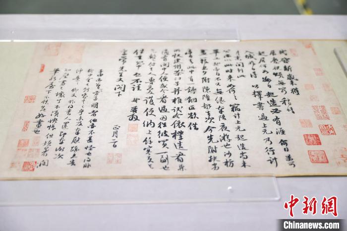 圖為展出的蘇軾《新歲展慶帖》真跡。中新網(wǎng)記者 駱云飛攝