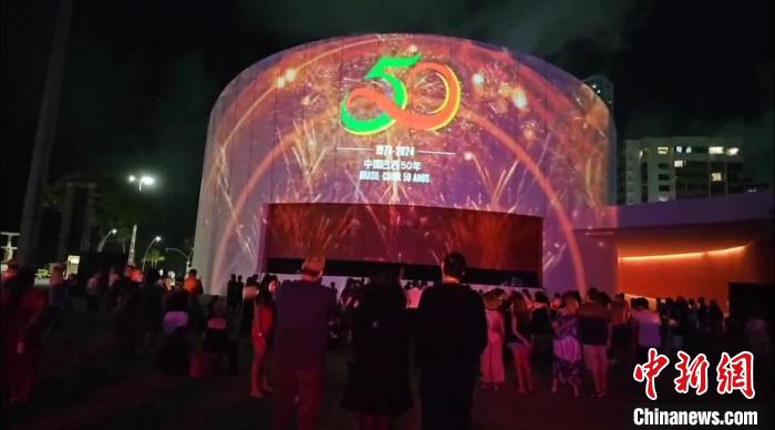 2月3日晚間,累西腓燈光秀匯演活動中展示了中巴建交50周年的紀念標志。曹璇攝