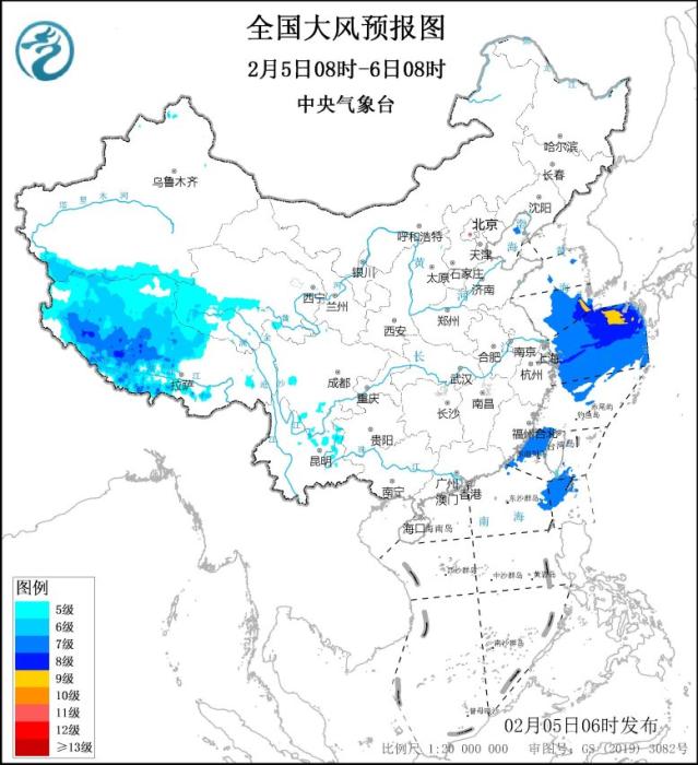 中央氣象臺(tái)2月5日06時(shí)繼續(xù)發(fā)布大風(fēng)藍(lán)色預(yù)警:預(yù)計(jì),2月5日08時(shí)至6日08時(shí),西藏中西部、青海西南部等地將有5~7級(jí)、陣風(fēng)8級(jí)的大風(fēng);黃海南部海域、東海大部海域、臺(tái)灣海峽、巴士海峽將有7~8級(jí)、陣風(fēng)9級(jí)的大風(fēng),其中黃海東南部、東海東北部的部分海域風(fēng)力可達(dá)9級(jí)、陣風(fēng)10級(jí)。