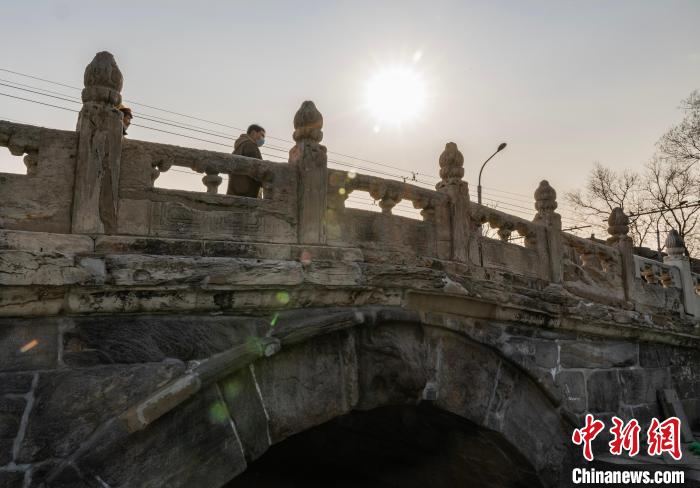 2023年2月22日,位于北京市西城區(qū)的“北京中軸線第一橋”——萬寧橋映襯在陽光之下。萬寧橋始建于元代,為單孔石拱橋,橫跨在什剎海前海東岸的玉河上,西鄰什剎海前海,是《北京中軸線保護管理規(guī)劃(2022年—2035年)》確定的遺產(chǎn)區(qū)要素之一。中新社記者侯宇攝