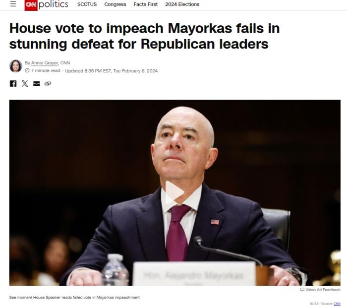 中新網2月7日電 綜合美媒報道,當?shù)貢r間6日,美國國會眾議院以214票對216票的表決結果,未能通過對美國國土安全部長馬約卡斯的彈劾案。