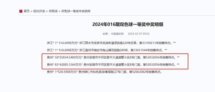 記者致電貴州省福利彩票發(fā)行中心,相關(guān)工作人員表示,在貴州的134注一等獎中,133注為同一銷售網(wǎng)點(diǎn)銷售,由兩張彩票組成。銷售網(wǎng)點(diǎn)的地址為貴州安順市平壩區(qū)黎平大道堡墅小區(qū)8號門面,編號為第52032056號。