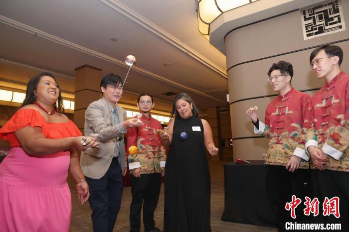 2月8日,曾在香港和國際賽事中屢獲殊榮的香港劍球(亦稱劍玉)隊成員(著唐裝者)獲香港駐多倫多經(jīng)貿(mào)處邀請訪加并出席新春酒會時,指導與會嘉賓體驗劍球。 中新社記者 余瑞冬 攝