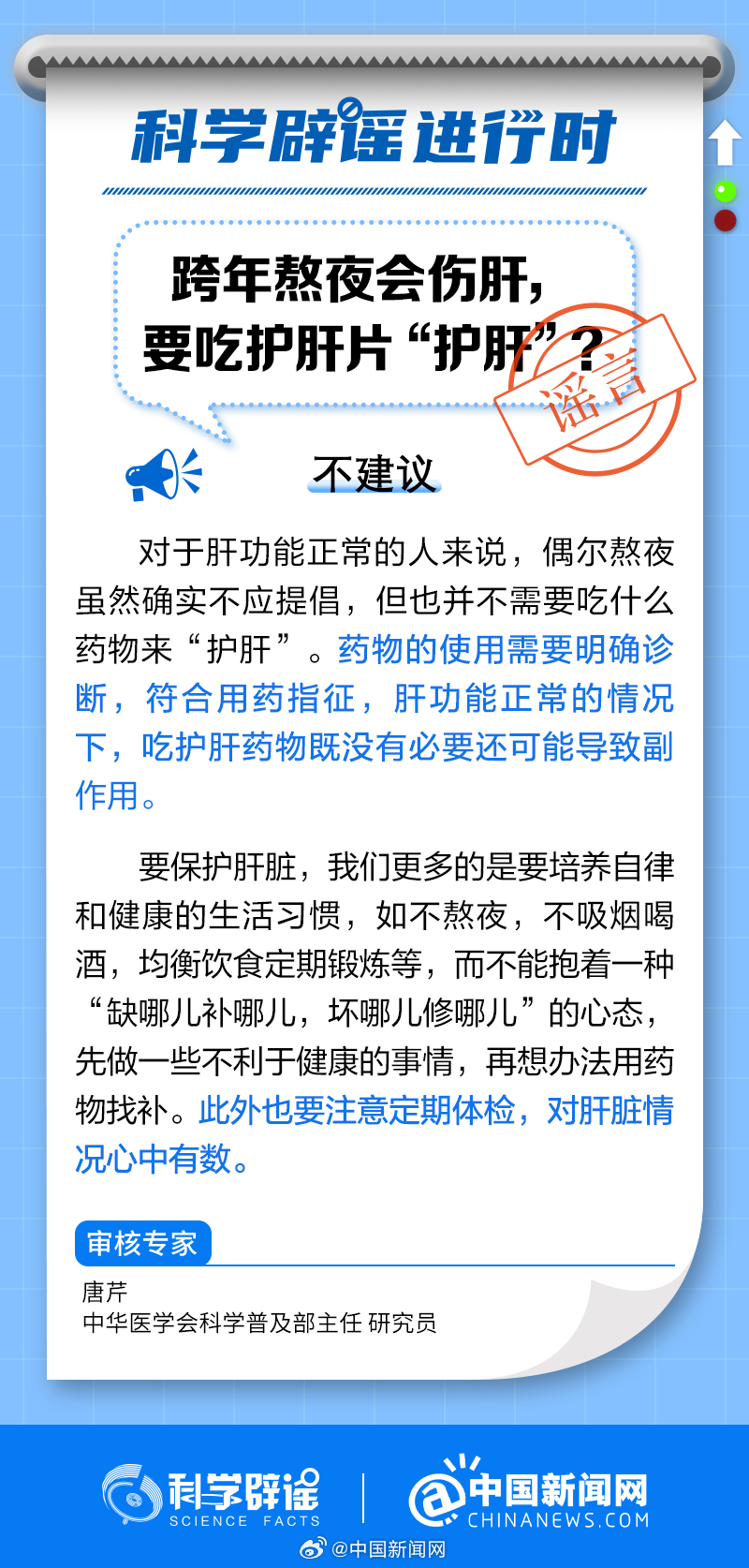 中新網(wǎng)2月10日電 對(duì)于肝功能正常的人來(lái)說(shuō),偶爾熬夜不需要吃什么藥物來(lái)“護(hù)肝”。藥物的使用需要明確診斷,符合用藥指征,肝功能正常的情況下,吃護(hù)肝藥物既沒有必要還可能導(dǎo)致副作用。要保護(hù)肝臟,我們更多的是要培養(yǎng)自律和健康的生活習(xí)慣,如不熬夜、不吸煙喝酒、均衡飲食、定期鍛煉等。(來(lái)源:@科學(xué)辟謠 中國(guó)新聞網(wǎng)微博)