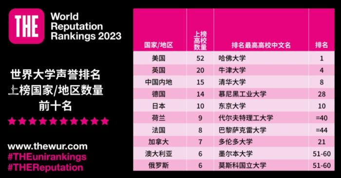 中國內(nèi)地高校的聲譽持續(xù)上升,共有15所高校上榜,其中8所進入世界前100名。清華大學遙遙領(lǐng)先,從2021年的世界第10名、2022年的世界第9名,再次上升了一位到2023年的世界第8名。北京大學再次上升兩位,從2021年的世界第15名、2022年的世界第13名上升到2023年的第11名。