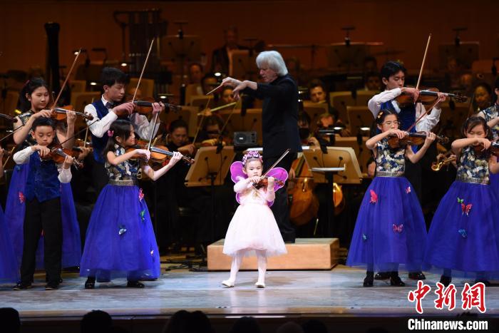 當(dāng)?shù)貢r(shí)間2月10日晚,美國(guó)太平洋交響樂(lè)團(tuán)與橙郡音樂(lè)與舞蹈藝術(shù)中心的孩子們合作演奏小提琴協(xié)奏曲《梁祝》?!≈行律缬浾? 張朔 攝