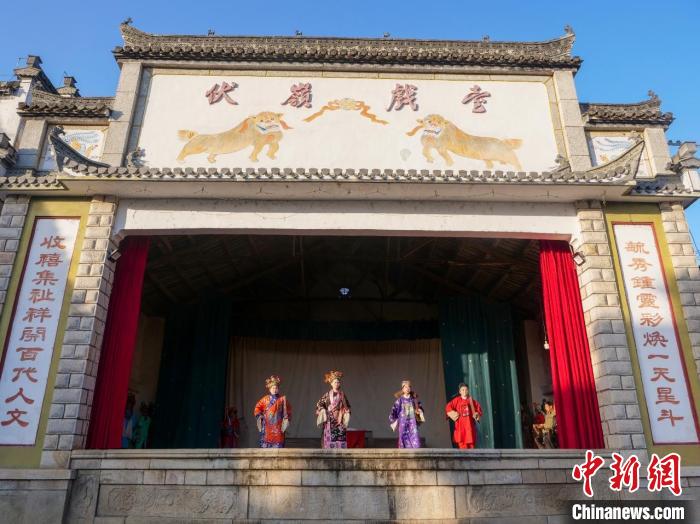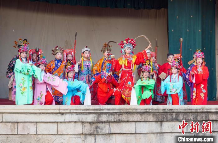 資料圖:安徽省宣城市績溪縣伏嶺鎮(zhèn),徽戲童子班的演員們在戲臺上表演?!堄晟?攝