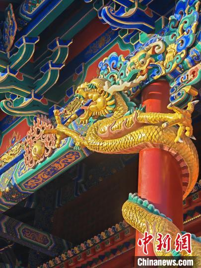 崇政殿的抱頭梁被雕成了一條龍的形象,外檐柱頭裝飾高浮雕龍頭,龍尾一直延伸到殿內(nèi)?!?沈陽故宮博物院 供圖)