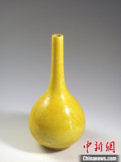 據(jù)沈陽故宮博物院研究館員李曉麗介紹,龍紋在發(fā)展過程中經(jīng)常和吉祥紋飾組合到一起。如清康熙款黃釉錐把瓶的口沿以下器身滿飾錐拱紋飾,暗刻流云、火焰圖案,瓶腹中部暗刻一龍一鳳形象,相向而飛,寓意“龍鳳呈祥”。腹下部近足處,有一圈海水紋飾。“這種暗刻紋龍鳳、流云、海水圖案,在康熙、雍正兩朝較為盛行?!?/p>