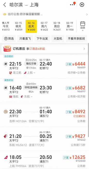 這個冬天,“爾濱”出圈,帶動東北旅游熱。16日至17日,從哈爾濱、沈陽直飛北京、上海的機票只剩高價公務(wù)艙,長春直飛這兩大目的地的機票僅余少量經(jīng)濟艙。其中,哈爾濱飛往上海的部分公務(wù)艙價格已經(jīng)上萬,哈爾濱飛往其他熱門目的地的機票價格也動輒五六千元。