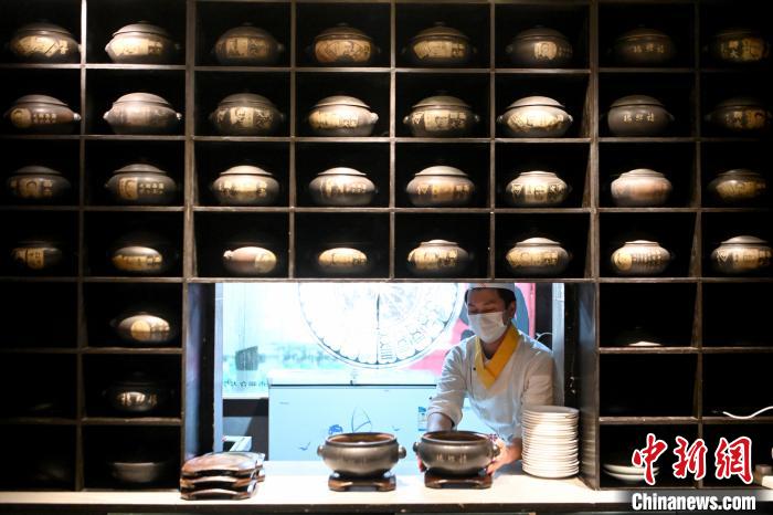 圖為昆明福照樓餐廳內(nèi)汽鍋雞被擺放在點(diǎn)菜臺(tái)“C位”?! ±罴螊?攝