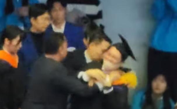 據(jù)在場人員透露,在尹錫悅致辭時,一名身穿學士服的男生面向尹錫悅所站立的講臺高喊。之后,總統(tǒng)警衛(wèi)人員捂住他的嘴巴,并把他強行抬出會場。