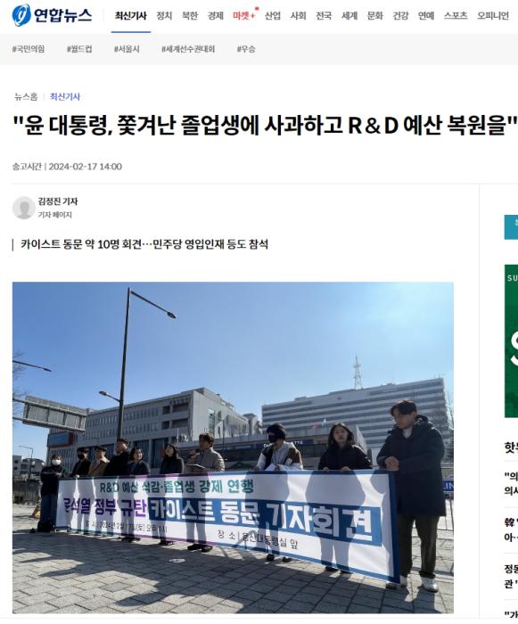 17日,韓國科學技術(shù)研究院的校友在龍山總統(tǒng)府前舉行記者會,他們表示:“尹錫悅總統(tǒng)毫不留情地堵住畢業(yè)生的嘴,并將其趕了出去,對此我們感到非常憤怒?!彼麄円笠a悅道歉,并恢復削減的研究與開發(fā)預算。
