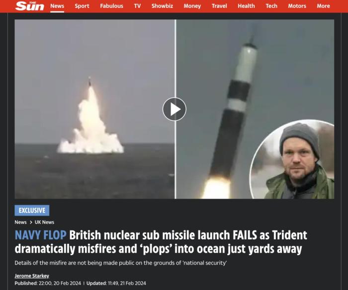 該部在發(fā)給《太陽報》的一份聲明中表示:“‘先鋒’號及其船員已被證明完全有能力操作英國的海上威懾力量。此次試射再次證實了英國核威懾力量的有效性,我們對此擁有絕對信心。測試過程中出現(xiàn)了異常情況。出于國家安全的考慮,我們無法提供有關(guān)此問題的進一步信息,但我們相信該異常是針對特定事件的,因此對更廣泛的‘三叉戟’導(dǎo)彈系統(tǒng)和庫存的可靠性沒有影響。”