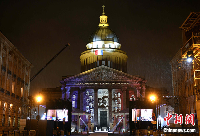 當(dāng)?shù)貢r間2月21日晚,法國二戰(zhàn)時期抵抗德國納粹侵略的戰(zhàn)士米薩克·馬努尚與他的夫人梅麗內(nèi)一同入葬先賢祠。圖為馬努尚夫婦和抵抗納粹小組成員的照片被投射到先賢祠的正門上。 中新社記者 李洋 攝