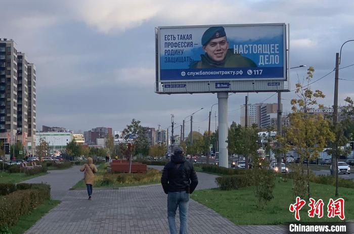 2023年10月,俄羅斯圣彼得堡街道上的征兵海報?!≈行律缬浾?商永 攝