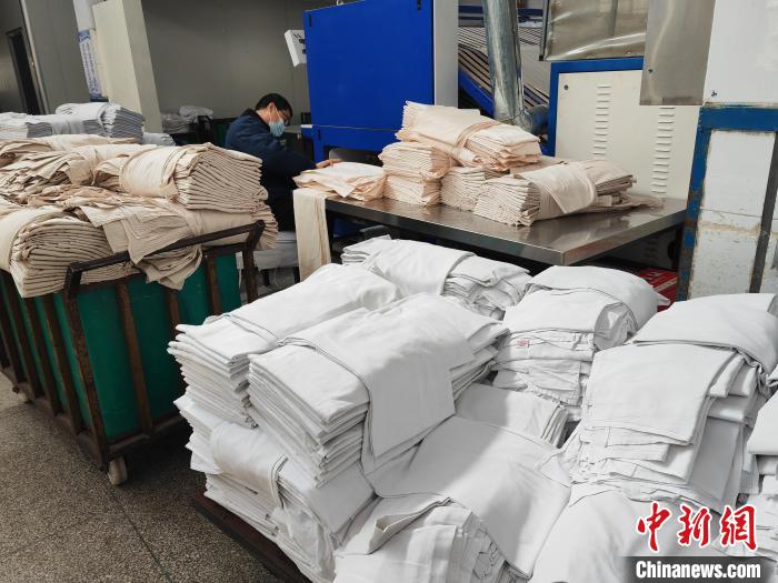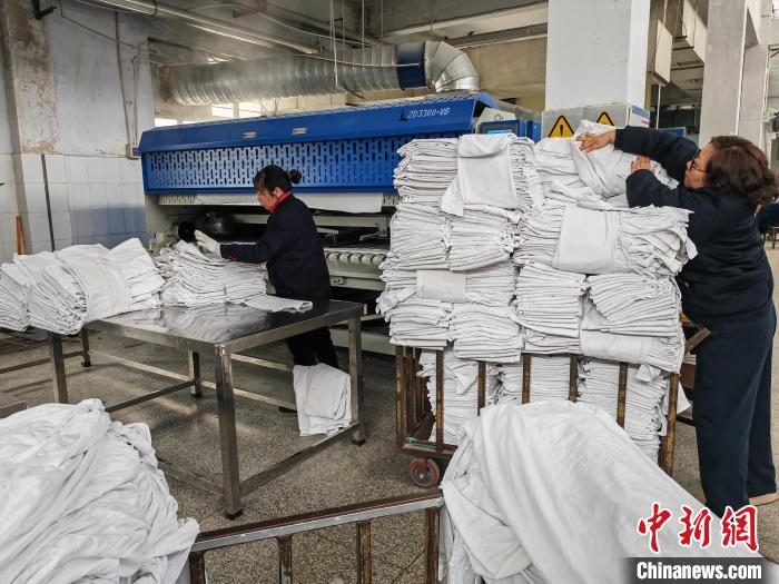 臥具從工業(yè)洗衣機(jī)里撈出后,就進(jìn)入烘干、消毒、熨燙工序,從進(jìn)入烘干機(jī)到再?gòu)撵贍C機(jī)出來,只需10秒,原本滴水的臥具就變得干燥平展。這對(duì)負(fù)責(zé)折疊、打包的洗滌工手速有著極高的要求。