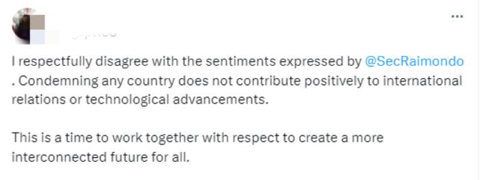 還有網(wǎng)友表示,譴責任何國家,不會對國與國之間的關系和科技進步帶來積極貢獻,“現(xiàn)在是時候共同努力,為所有人創(chuàng)造一個更好溝通的未來。”