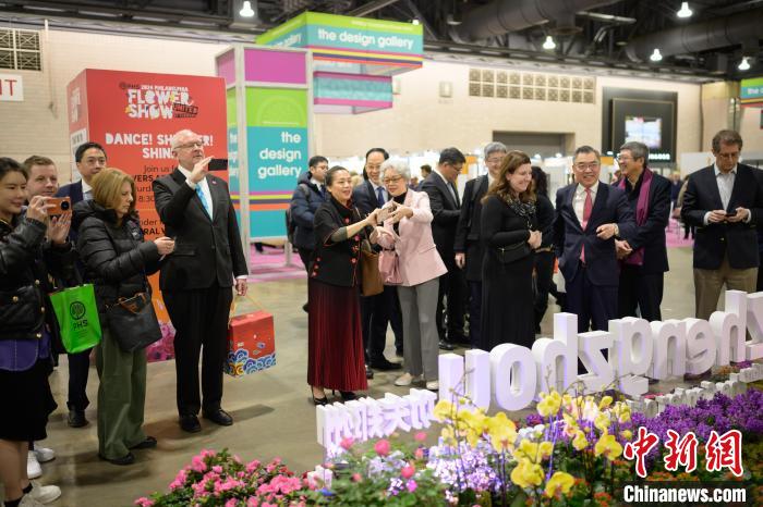 當(dāng)?shù)貢r(shí)間3月2日,一年一度的費(fèi)城花展在美國(guó)賓夕法尼亞州費(fèi)城開幕,以“功夫鄭州——花俏嵩山”為主題的鄭州展園當(dāng)天在花展上亮相。圖為中國(guó)駐紐約總領(lǐng)事黃屏(右三)帶領(lǐng)嘉賓參觀鄭州展園?!ranck Zhou 攝