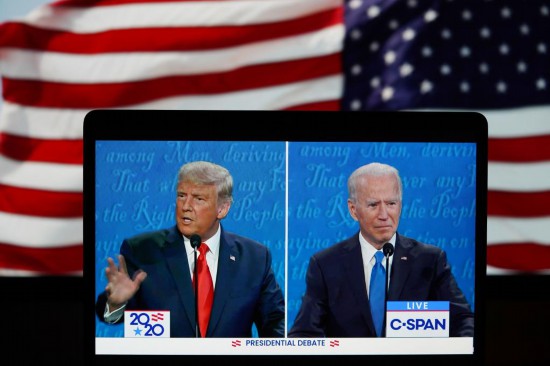 這張2020年10月22日在美國弗吉尼亞州阿靈頓拍攝的視頻畫面顯示,時任美國總統(tǒng)特朗普(左)與當(dāng)時的民主黨總統(tǒng)候選人拜登在田納西州納什維爾市參加最后一場總統(tǒng)候選人電視辯論。新華社記者 劉杰 攝