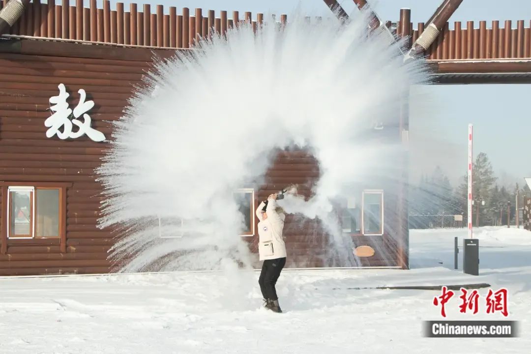 游客在極寒天氣中體驗潑水成冰的快樂。 根河市委宣傳部供圖