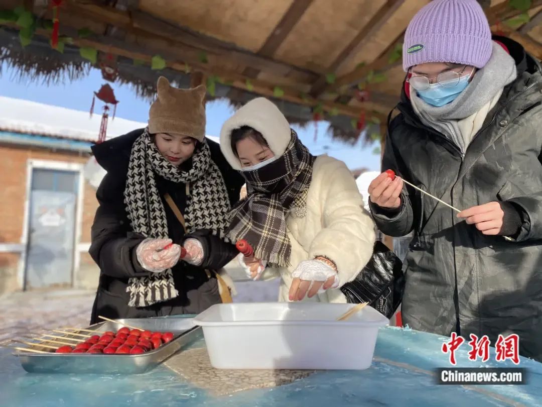 游客在冷極村體驗手作糖葫蘆。 張瑋 攝