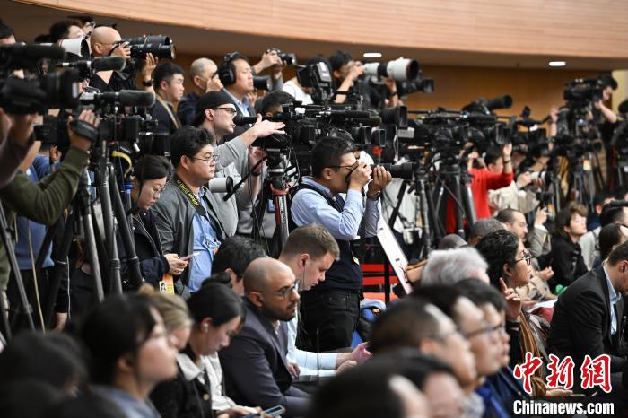 3月6日,十四屆全國人大二次會議在北京舉行記者會,國家發(fā)展和改革委員會主任鄭柵潔、財政部部長藍(lán)佛安、商務(wù)部部長王文濤、中國人民銀行行長潘功勝、中國證券監(jiān)督管理委員會主席吳清就發(fā)展改革、財政預(yù)算、商務(wù)、金融證券等相關(guān)問題回答中外記者提問。圖為中外記者在現(xiàn)場采訪?!≈行律缬浾?何蓬磊 攝