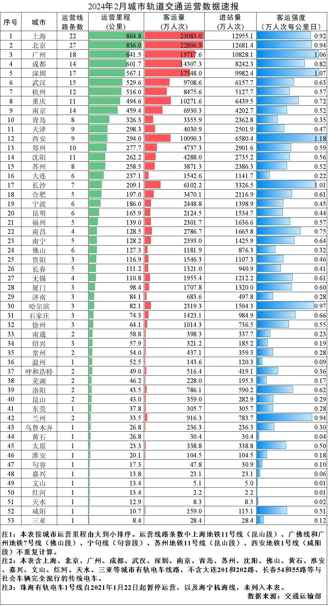 中新網(wǎng)3月12日電 據(jù)交通運(yùn)輸部微信公眾號(hào)消息,2024年2月,31個(gè)省(自治區(qū)、直轄市)和新疆生產(chǎn)建設(shè)兵團(tuán)共有55個(gè)城市開(kāi)通運(yùn)營(yíng)城市軌道交通線路308條,運(yùn)營(yíng)里程10205.6公里,實(shí)際開(kāi)行列車(chē)317萬(wàn)列次,完成客運(yùn)量20.5億人次,進(jìn)站量12.4億人次。2月份,客運(yùn)量環(huán)比減少6.1億人次,降低22.9%,同比減少1.3億人次,降低6%。2月份全國(guó)總運(yùn)營(yíng)里程的平均客運(yùn)強(qiáng)度為0.693萬(wàn)人次每公里日,環(huán)比降低17.6%,同比降低14.4%。本月無(wú)新開(kāi)通線路。