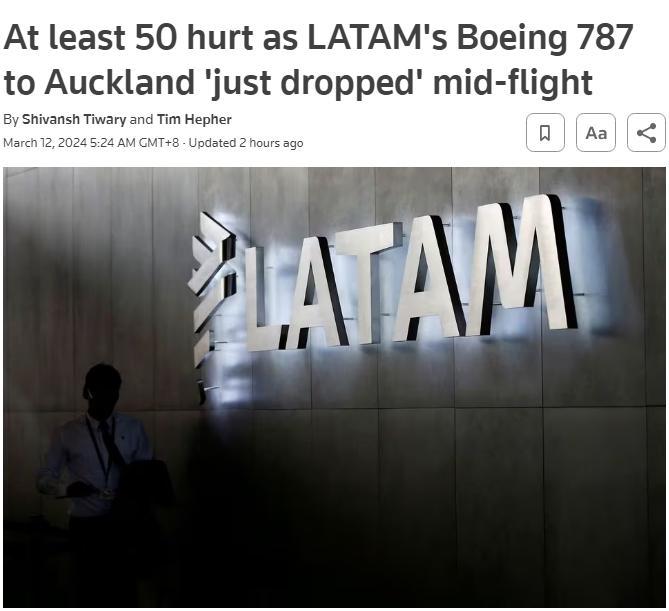 當(dāng)時(shí), 總部位于智利的拉塔姆航空公司一架從澳大利亞悉尼飛往新西蘭奧克蘭的波音飛機(jī),因技術(shù)問(wèn)題,在飛行途中急降,“劇烈俯沖”數(shù)秒,導(dǎo)致乘客撞上機(jī)艙頂,造成至少50人受傷。