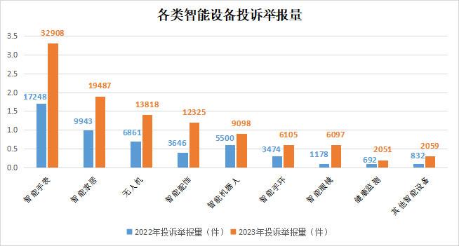 隨著物聯(lián)網(wǎng)、人工智能、5G通信等技術(shù)的突破,智能設(shè)備不斷更新迭代。各類可穿戴智能設(shè)備、智能家居越來越受到消費(fèi)者的青睞,相關(guān)消費(fèi)糾紛增長較快。2023年,全國12315平臺共接收智能設(shè)備投訴舉報10.4萬件,同比增長1.1倍。其中智能手表(3.3萬件)、智能家居(1.9萬件)投訴舉報較多;智能眼鏡、智能配飾類別增長較快,分別同比增長4.2倍、2.4倍。消費(fèi)者反映問題主要集中在售后服務(wù)困難、泄露消費(fèi)者個人信息、產(chǎn)品實際功能與宣傳不符等。