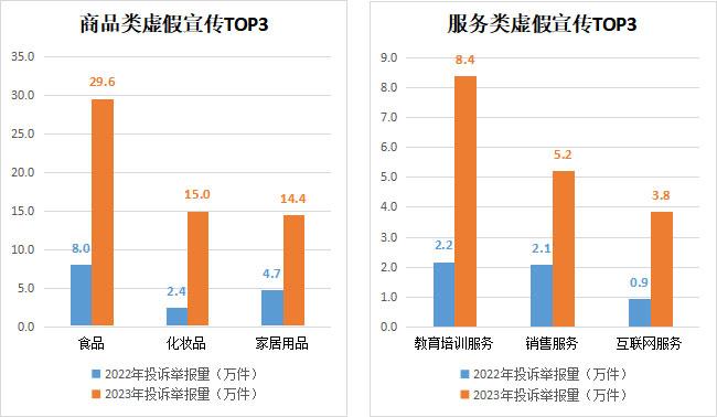 消費(fèi)者在購物時會接觸到各種各樣的宣傳信息,但海量的宣傳信息并非都是真實可信的,一些商家以夸大其詞、隱瞞真相等手段,誘使消費(fèi)者做出錯誤的消費(fèi)選擇。2023年,全國12315平臺接收虛假宣傳投訴舉報144.3萬件,同比增長1.7倍。從商品服務(wù)類別來看,商品類別中虛假宣傳投訴舉報較多的有食品(29.6萬件)、化妝品(15萬件)、家居用品(14.4萬件);服務(wù)類別中虛假宣傳投訴舉報較多的有教育培訓(xùn)服務(wù)(8.4萬件)、銷售服務(wù)(5.2萬件)、互聯(lián)網(wǎng)服務(wù)(3.8萬件)。消費(fèi)者反映的問題主要集中在商家虛構(gòu)產(chǎn)品效果、夸大產(chǎn)品優(yōu)勢,通過“好評返現(xiàn)”提高虛假聲譽(yù),誤導(dǎo)消費(fèi)者購買等。