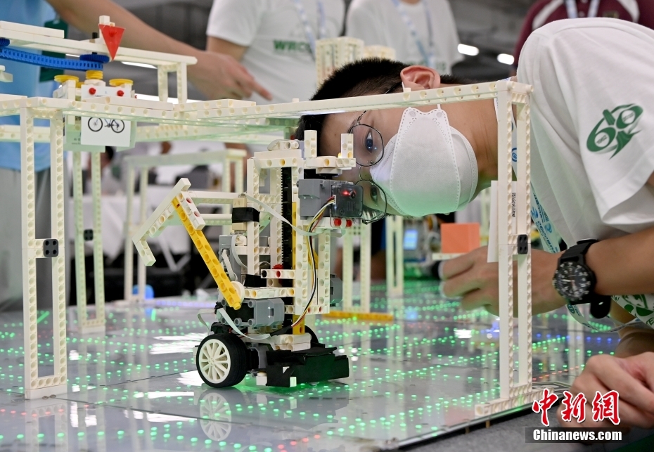 資料圖:一名學(xué)生在觀摩自己設(shè)計編程的機器人。中新社記者 侯宇 攝