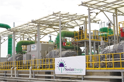 由中國企業(yè)承建的肯尼亞索西安地熱電站于去年6月底投產(chǎn)送電,成為非洲首個從設計、產(chǎn)品生產(chǎn)到建設、調(diào)試完全由中國企業(yè)獨立完成的地熱發(fā)電站。該電站設計裝機容量35兆瓦,每年可減少二氧化碳排放24萬噸。圖為索西安地熱電站2號發(fā)電機組。